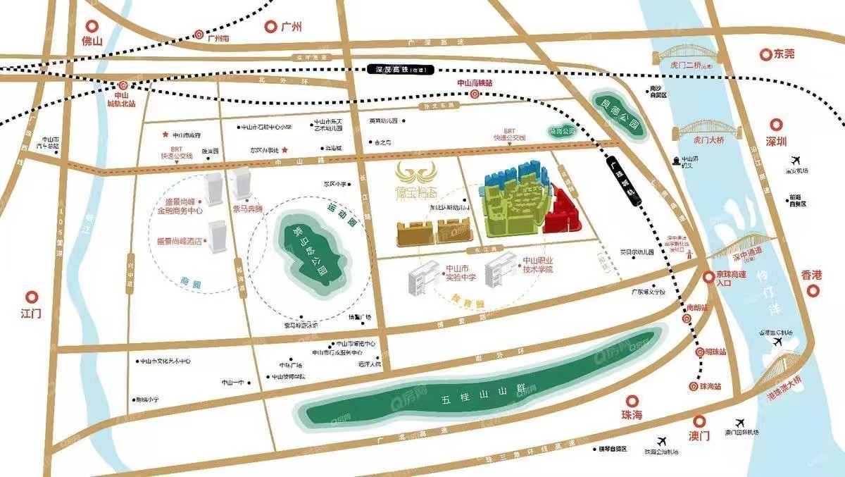項目位于中山東區和火炬開發區交匯處,南臨城市主干道中山六路,鏈接多道路交匯路網,悅享暢達交通,縱享城區交通多重利好。項目滿足品質舒居設想,低密度、大廣角景觀、高舒適度、高智能化的花園美宅,95-150㎡兩房至四房戶型,全功能空間靈動延伸,清新闊景視野,居于室而縱享自由。健康生態人居理念貫徹于社區設計當中,三五鄰友,溫馨一家,相伴行走于悠閑暢泳區、放松緩跑區、親子童趣區、高爾夫景觀公園,營造充滿活力、鄰里互動的全齡段365日運動時光。